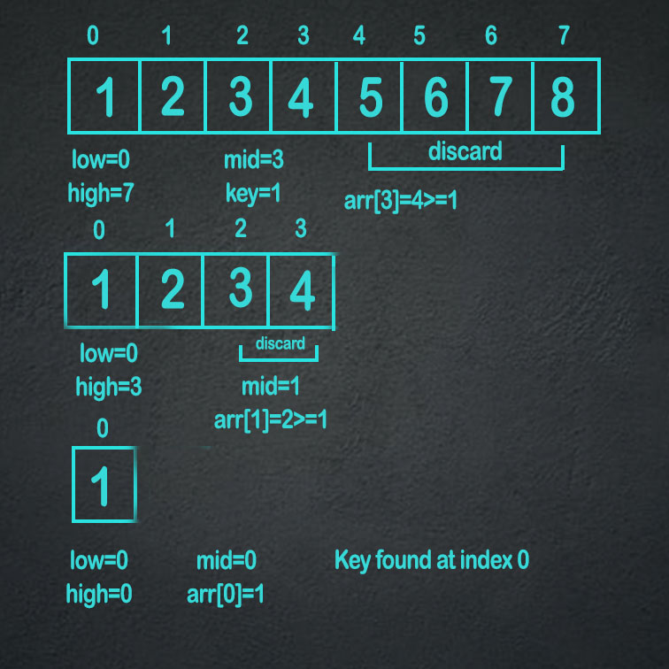 - Else if arr[mid] >= key, this means that the key is smaller than the middle element. Hence, we would search for the key between index 0 to mid-1.